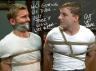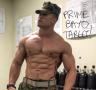 The raiders were moving through the barracks slowly and quietly. When they entered Jake's room, he was caught totally off-guard; he had just slipped off his underwear - now holding it in his hand - and was standing there, naked, in front of his bed. The instant he looked at the movement by the door in surprise, one of the darkened raiders pulled the trigger on his gun, and a slug made a silent "phewt" sound as it shot from the gun, and a millisecond afterwards made a "thoonk" sound as it thudded right into Jake's muscular torso, a persfect shot right in the gut through his shallow innie.
