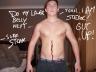 With a powerful, single swing around Allen's firm body, Scott buried the knife to the hilt, deep into Allen's navel. Allen's hips jumped forward in a powerful thrust. His eyes widened as his painful yells were muffled in Scott's strong hand. Scott held him there for a few seconds feeling the strong sophomore's chest heaving and writhing in pain. He then let go of the knife, which was still protruding from Allen's fully-stretched abs.