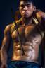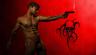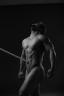 Bare chested warrior explores belly button bayoneting.