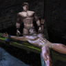 You know how to finish this. Gripping a handle in each hand, you give the blades a fast twist, turning them a quarter turn. Almost instantly, our bodies stiffen and both of us are brought up to our toes. Every muscle in our bodies flexes, forcing our bodies even more firmly against each other as we let out a final gasp. Our man-juices drip from beneath our loin cloths and mingle with the blood flowing down our legs.
